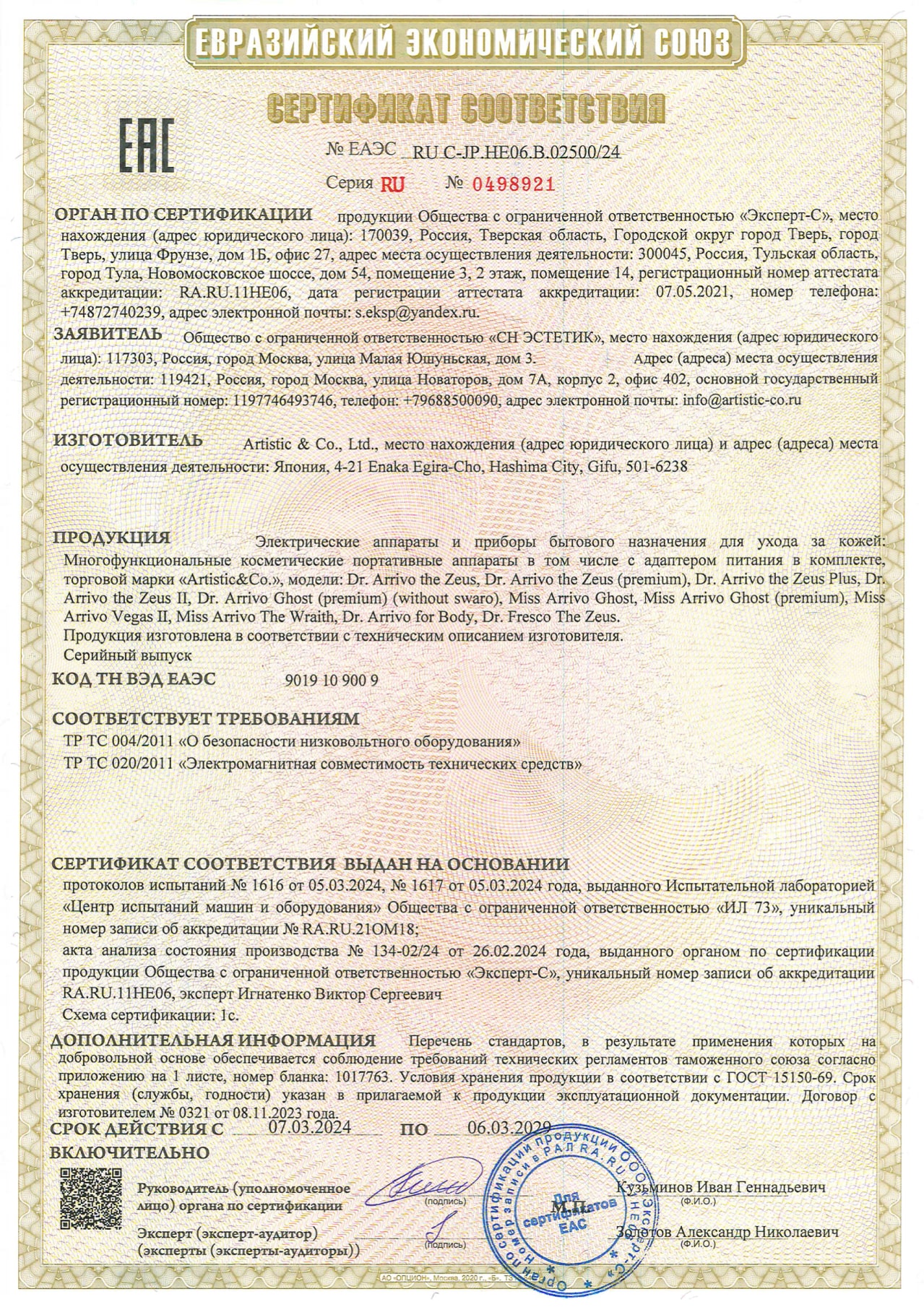 Аппараты Artistic&Co. произведены и импортированы из Японии, прошли испытания, сертифицированы и соответствуют всем обязательным требованиям качества и безопасности, установленным в Технических регламентах Евразийского экономического союза.